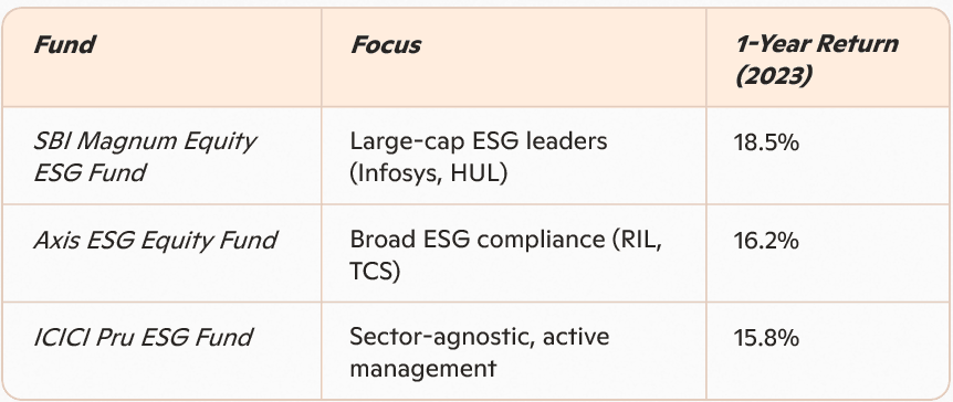 - Aditya Birla SL ESG Fund: Focuses on low-carbon and gender-diverse firms.