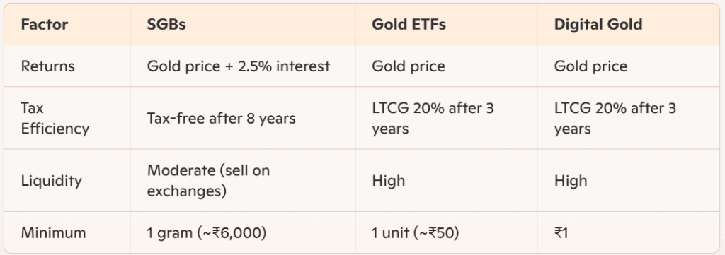 Caveat: Not as tax-efficient as SGBs; capital gains taxed like physical gold.