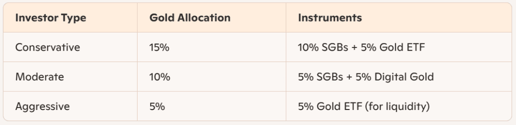 – Long-Term/Safety: SGBs (tax-free, interest income).