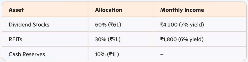 - Start Early: Compounding boosts passive income over time (e.g., ₹10L at 7% yield = ₹70,000/year).