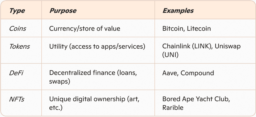 - Stablecoins: Crypto pegged to fiat (e.g., USDT = $1).